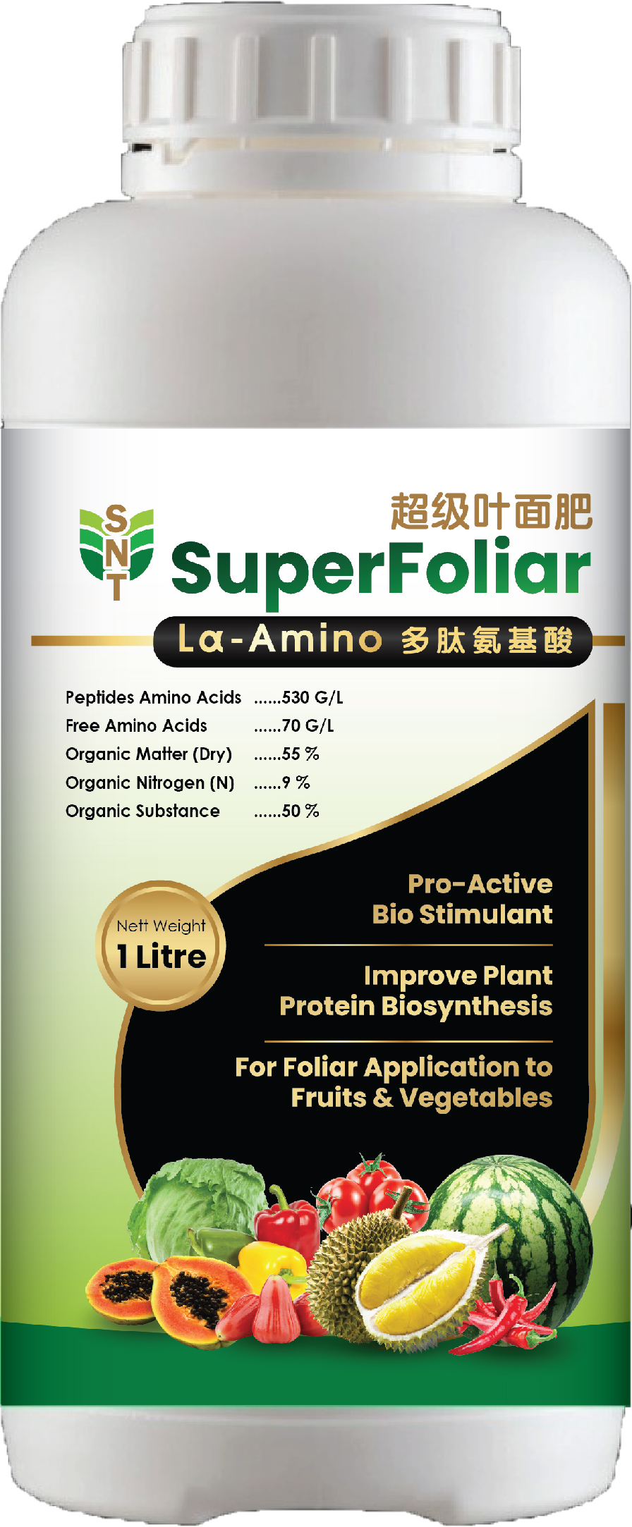 超级叶面肥 - 多肽氨基酸 是一种基于聚谷氨酸、氨基酸和多肽的液体有机生物刺激剂。氨基酸作为各种营养物质的天然络合剂,刺激植物从土壤中吸收溶解的营养蛋白物质,并通过叶面施用微量元素。由于多肽氨基酸优异的表面附着力,提高了通过叶面对微量养分的吸收。氨基酸的直接好处是易于被根和叶吸收,并且很容易作为蛋白质生物合成的组成部分。这为其他植物代谢过程(促进光合作用)节省了能量。氨基酸和肽是植物的进一步氮源,而氮矿化发生在土壤中。